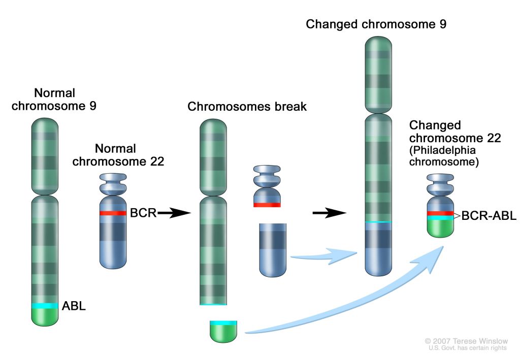 One bright example of how important is to identify fusion genes is represented by the case of chronic myeloid leukemia. In this type of blood cancer, the short bottom piece of chromosome 9 and the short top piece of chromosome 22 attach to one another. This translocation creates a longer chromosome 9 and a shorter chromosome 22 (see the figure below). The shorter chromosome 22 is called the Philadelphia chromosome. As a result of this translation, the ABL gene from chromosome 9 and the BCR gene from chromosome 22 join together and form the BCR-ABL fusion gene, the biomarker of this type of cancer. Against this biomarker, it was developed a monoclonal antibody called imatinib (followed then by others), which inhibits the progression of 75% of cancers expressing BCR-ABL fusion gene.