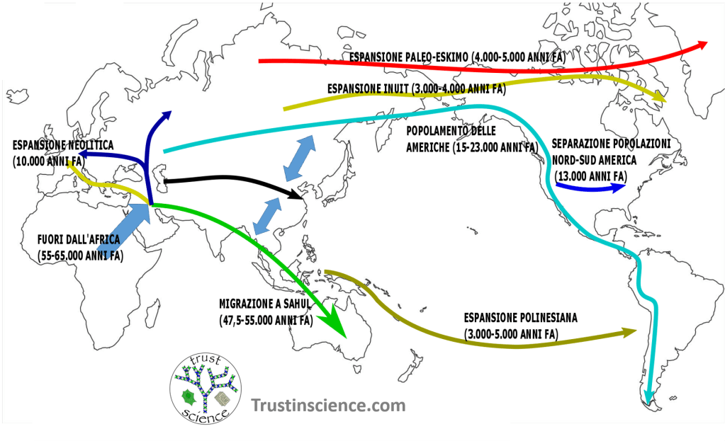 E cosa è successo quando l’uomo moderno è emigrato dall’Africa, per colonizzare gli altri continenti? Vista la complessità dell’argomento, in fondo al paragrafo ho aggiunto anche una rappresentazione grafica intuitiva.