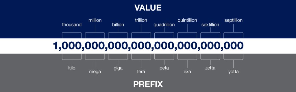 Sono trascorsi più di 20 anni dal primo completamento della sequenza del genoma umano. Questo traguardo ha portato alla generazione di una straordinaria quantità di dati. Le stime prevedono che la ricerca genomica genererà tra 2 e 40 exabyte di dati entro la prossima decade (guardate l’immagine sotto per vedere quanti zeri servono, stiamo parlando di miliardi di gigabytes).