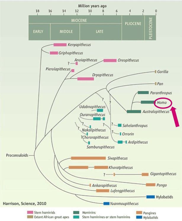 Human evolution does not follow a straight trajectory; instead, it unfolds like a bush with many branches. Each branch represents a human group, many of which went extinct without leaving descendants. Homo sapiens is just one small twig on this bush (marked with a red arrow in the diagram below), sharing the evolutionary tree with chimpanzees, gorillas, and orangutans—our closest relatives.
