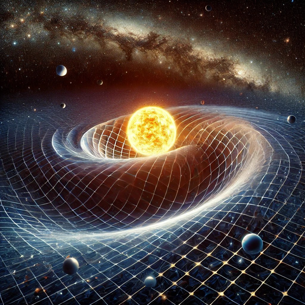 In Einstein’s universe, spacetime is a four-dimensional continuum, combining the three dimensions of space with time as the fourth dimension. Massive objects like the Sun create a dent or curve in this spacetime fabric. Smaller objects, like planets, move along these curves, much like marbles rolling around a dip on a stretched-out sheet. What we perceive as gravity is simply the motion of objects following these curved paths.